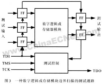 本文論及的待測系統(tǒng)包含所有三個功能模塊的單芯片,同樣也適用單個或多個模塊系統(tǒng)。一旦系統(tǒng)分塊完畢,邊界掃描結(jié)構(gòu)可以提供數(shù)字(模擬和存儲器)模塊的測試通路,如圖3所示。IEEE1149.1標(biāo)準(zhǔn)對其細(xì)節(jié)作出了規(guī)定。I/O端設(shè)置有觸發(fā)器(FFs),以構(gòu)成移位寄存器。信號TDI(測試數(shù)據(jù)輸入)、TDO(測試數(shù)據(jù)輸出)、TMS(測試模式選擇)、和TCK(測試時鐘)經(jīng)一測試控制電路提供測試操作信號。TMS和TCK為外部信號TDI和TDO與所有模塊的外部引腳相連。因此,任何測試輸入都可接于數(shù)字模塊或其輸出端,而不論系統(tǒng)中模塊的位置如何。