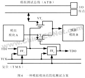 通常,ATB的引線數(shù)目與測試中同時應(yīng)用或觀察的I/O模擬信號數(shù)目相等。每一模擬模塊接有兩只晶體管和兩只觸發(fā)器,由它們控制觸發(fā)器與數(shù)字和模擬模塊的邊界掃描結(jié)構(gòu)相連。通過把TMS信號施加到測試模型中同時掃描觸發(fā)器中的相應(yīng)位。任一模擬模塊都能利用ATB測試,但須注意,測試中同時使用I/O信號時必須使用單獨的ATB引線。