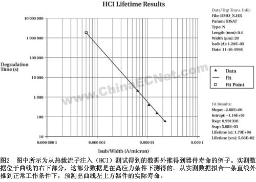 通過(guò)應(yīng)力檢測(cè)可以方便地做出曲線,并外推來(lái)預(yù)測(cè)器件的運(yùn)行壽命。由于器件的壽命通常都是用年來(lái)度量的,因?yàn)樾枰捎靡恍┦侄蝸?lái)加速測(cè)試。最有效的方法是讓器件處于應(yīng)力過(guò)載狀態(tài),然后測(cè)量可以衡量性能降低的關(guān)鍵參數(shù),將測(cè)得的參數(shù)外推得到器件的壽命。在圖2中,曲線的右下部分(實(shí)測(cè)數(shù)據(jù))就是在高應(yīng)力狀態(tài)下測(cè)得的。通過(guò)實(shí)測(cè)數(shù)據(jù)可以進(jìn)行線性外推用于預(yù)測(cè)正常工作條件下器件的壽命(曲線的左上部)。