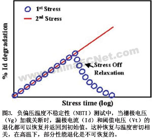 NBTI測(cè)試的特別之處在于其性能退化在去掉應(yīng)力加載之后還可以恢復(fù)(圖3)。當(dāng)柵極電壓(Vg)引入的應(yīng)力卸載之后,漏極電流(Id)和閾值電壓(Vt)的退化會(huì)逐漸恢復(fù)并最終返回到起始的情況;謴(fù)的速度對(duì)溫度的依賴程度很高。在室溫下完全恢復(fù)的情況也見(jiàn)諸報(bào)道。當(dāng)恢復(fù)之后如果再次在柵極引入應(yīng)力,性能退化將按照上次退化的曲線發(fā)展。但在較高溫度時(shí),將有一部分退化的性能是無(wú)法抵消的,這種情況稱為退化鎖定。