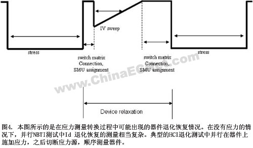 在并行NBTI測(cè)試中,當(dāng)應(yīng)力卸載后Id 退化恢復(fù)過(guò)程的測(cè)量是一個(gè)極大的挑戰(zhàn)。傳統(tǒng)的測(cè)試方法需要花很長(zhǎng)的時(shí)間來(lái)測(cè)試HCI退化,通常并行對(duì)器件加載應(yīng)力,之后將應(yīng)力源斷開(kāi),對(duì)器件進(jìn)行順序測(cè)量(圖4)。這種方法有兩個(gè)問(wèn)題:首先,從斷開(kāi)應(yīng)力源到開(kāi)始測(cè)量需要一段時(shí)間,而在這段時(shí)間內(nèi)一旦應(yīng)力源消失退化的恢復(fù)實(shí)際已經(jīng)開(kāi)始了;其次,由于順序測(cè)量器件,其測(cè)量時(shí)間也不同,那么退化恢復(fù)的程度也有差異。對(duì)于最后一個(gè)測(cè)量的器件來(lái)說(shuō),測(cè)量時(shí)其退化程度可能是第一個(gè)被測(cè)器件的一小部分。這些缺點(diǎn)要求采用無(wú)應(yīng)力轉(zhuǎn)換的開(kāi)關(guān)、可以完成多器件并行測(cè)量的測(cè)試方法。另外還要求可以通過(guò)幾點(diǎn)測(cè)試數(shù)據(jù)估測(cè)Vt 的退化情況,而不是像傳統(tǒng)方法那樣必須使用整條Id-Vg 曲線來(lái)測(cè)量Vt 退化。