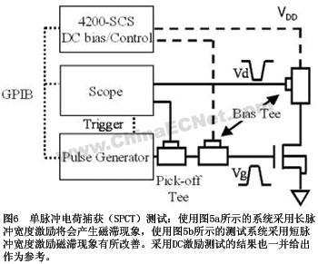 圖5所示的是兩套不同的單脈沖電荷俘獲(SPCT)測(cè)量系統(tǒng)的原理圖。在每套系統(tǒng)中,晶體管的漏極接一定的偏壓,在將脈沖激勵(lì)加到柵極上。由柵極脈沖引起Id的變化被記錄在示波器上。圖中兩套系統(tǒng)的不同之處在于帶寬,圖5b中所示的系統(tǒng)帶寬很高,可以捕獲很快的脈沖反應(yīng)(一直到數(shù)十納秒)。電荷陷阱一般對(duì)如此高速的脈沖都沒(méi)有反應(yīng)。因此可以測(cè)量到將電荷俘獲現(xiàn)象降至最低的"凈"晶體管性能。圖6所示為分別使用長(zhǎng)脈沖寬度(方波)和短脈沖寬度(三角波)測(cè)量SPCT的結(jié)果;在長(zhǎng)脈沖寬度激勵(lì)的Id-Vg曲線中,磁滯現(xiàn)象即是由電荷俘獲造成的。在短脈沖激勵(lì)的SPCT測(cè)試中,也可以觀察到一些磁滯現(xiàn)象,這是由于薄膜在較短的時(shí)間里也俘獲了一部分電荷造成的。