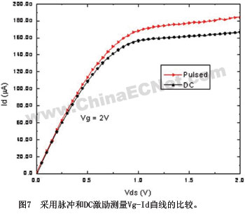 在較短脈沖寬度情況下,電荷俘獲現(xiàn)象將會(huì)大大減弱,因此測(cè)得的Id比DC條件下測(cè)量值要高(圖7)。