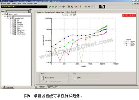 就像前文所指出的那樣,可靠性測(cè)試需要與新器件的設(shè)計(jì)和新材料的使用密切關(guān)聯(lián)。盡管HCI測(cè)試仍然是可靠性測(cè)試中非常重要的一環(huán),但工程師們?cè)絹?lái)越關(guān)注于PMOS的NBTI測(cè)試;高k柵極晶體管的電荷俘獲現(xiàn)象;以及NBTI、TDDB和HCI的疊加效應(yīng),例如NBTI增強(qiáng)的熱載流子和TDDB增強(qiáng)的NBTI等。為了面對(duì)這些新挑戰(zhàn),測(cè)試方法已經(jīng)從DC應(yīng)力激勵(lì)和DC、脈沖應(yīng)力同時(shí)作用轉(zhuǎn)向性能退化中的松弛現(xiàn)象研究。更進(jìn)一步,當(dāng)前的測(cè)試儀器包含有更全面的參數(shù)用以表征器件性能,其中包括DC I-V、C-V、電荷抽取和電荷俘獲(圖8)。