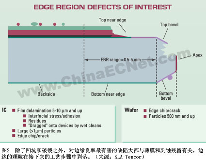 今天的邊緣檢查是針對晶圓制造的優(yōu)化,而不是IC。已有的設(shè)備通常都是基于激光散射的,配備有幾路CCD成像,或者僅基于明場成像。同時它可用于檢測裂紋、碎片、可能的顆粒和水泡,這些缺陷降低了邊緣良率,很可能與薄膜和刻蝕殘留相關(guān)-它們留在晶圓邊緣,在接下來的工藝步驟中剝落下來(圖2)。