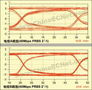 從圖2可以看到,兩種電纜的差分傳輸損耗差不多,而電纜A得近端串擾則相對比較大。圖3使用了仿真軟件,仿真20米長的電纜,傳輸40Mbps信號的眼圖情況,仿真使用的電纜模型是利用上面頻域測試得到的模型,通過仿真可以看到電纜B的眼圖比電纜A的眼圖要好,不論眼高還是眼圖抖動。