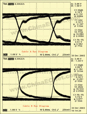 圖4是實際應用的眼圖情況,很明顯電纜B的眼圖要比電纜A的眼圖要好,和前面的仿真結(jié)果比較吻合,不過電纜A的實際反射比較大一點,這和仿真使用驅(qū)動器件的模型有關。